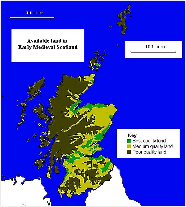 Шотландия имеет обширную береговую линию и обширные территории с труднопроходимой местностью и бедными сельскохозяйственными угодьями. В этот период из-за изменения климата многие земли стало непригодны для обработки. Поэтому плотность населения стала относительно низкой, особенно во внутренних районах и Хайленде. В Северной Британии не было городских центров, а поселения основывались на фермах и вокруг укрепленных крепостей, в том числе таких как брохи. Сельское хозяйство было смешанным, в основном основанным на самодостаточности.
