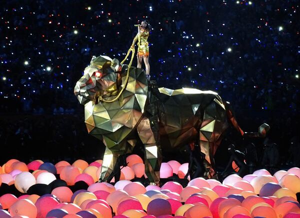 Осенью 2014 года Перри и её команда обратились к дизайнеру Майклу Карри с просьбой создать механического льва, на котором певица собиралась выехать на поле. Перри попросила Карри разработать дизайн животного, стилизованный под оригами. В середине ноябре компания начала разработку модели — вначале на компьютере, чтобы создать оптимальное соотношение между размером и весом, а затем и настоящий объект длиной почти 8 метров, высотой около 5 метров и весом более 700 кг. Позвоночник льва был собран из алюминиевых трубок, для соединения остальных частей модели использовалось углеродное волокно. Отражающие панели, составлявшие внешнюю оболочку льва, были сделаны из тонкого поликарбоната, покрытого золотой краской. Такое сочетание алюминия, углеродного волокна и поликарбоната позволило создать крепкую и в то же время лёгкую и подвижную модель. Внутри льва находилось 18 шарниров, позволяющих ему двигать головой, шеей, плечами и лапами. Однако из-за его веса движения были в три раза медленнее, чем у настоящего животного. Механическим животным управляли 11 человек[22].