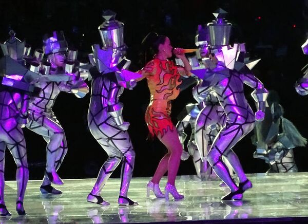 В самом начале шоу участники, находившиеся на поле стадиона, подняли над головам разноцветные светящиеся шары. С высоты картина, созданная этими шарами, представляла собой логотип компании Pepsi[23]. Вскоре после этого на поле выехала Кэти Перри верхом на большом золотом механическом льве, открыв концерт исполнением песни «Roar»[24]. После этого она спела «Dark Horse», а в это время на поле проецировалось трёхмерное изображение шахматной доски, клетки которой периодически меняли форму и размер. В ходе этой песни исполнительницу сопровождали танцоры в костюмах шахматных фигур[23][25]. Далее Кэти в дуэте с Ленни Кравицем исполнила песню «I Kissed a Girl», во время которой позади певцов вздымались языки пламени[25][26]. Во время исполнения этих трёх песен Кэти была одета в «огненное» платье, а её волосы были завязаны в конский хвост[25]..