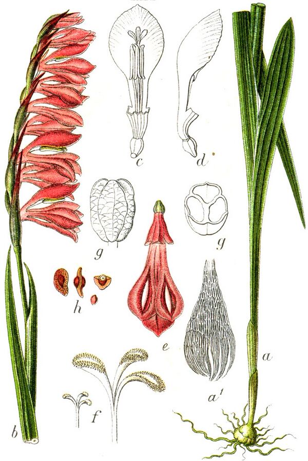 Гладиолус черепитчатый содержит иридин — гликозид изофлавона иргенина, масло, крахмал, сахар, эфирное масло.