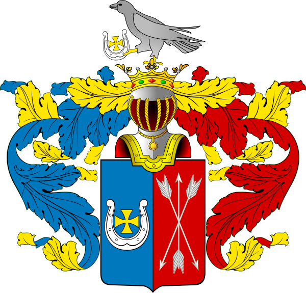 На щите дворянский коронованный шлем. Нашлемник: птица, держащая подкову с крестом. Намёт на щите голубой и красный, подложенный золотом.