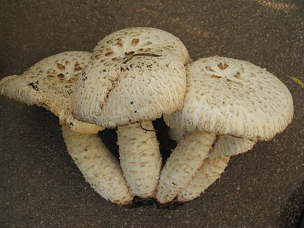 Плодовые тела шляпконожечные. Шляпка взрослых грибов достигает 4—18 см в диаметре[4], по другим данным — от 3 до 13 см[5]. Вначале шляпка выпуклая, затем уплощается, иногда становится неглубоко вдавленной, мясистая. Верхняя поверхность шляпки беловатая, сероватая или коричневатая, часто с более тёмными хлопьевидными чешуйками, особенно в центральной части. Кутикула шляпки — кутис.
