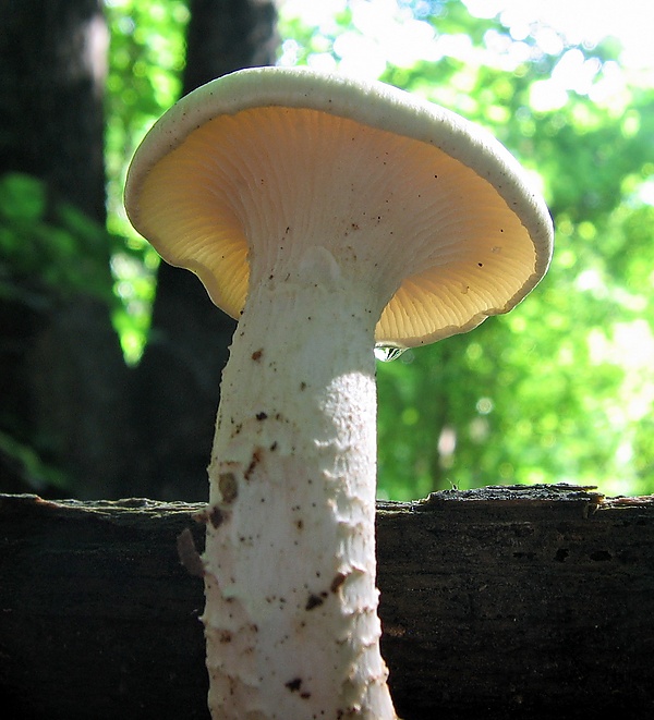 Гименофор пластинчатый. Пластинки частые, нисходящие на ножку, с зазубренным краем, беловатого цвета. Споровый порошок белый.