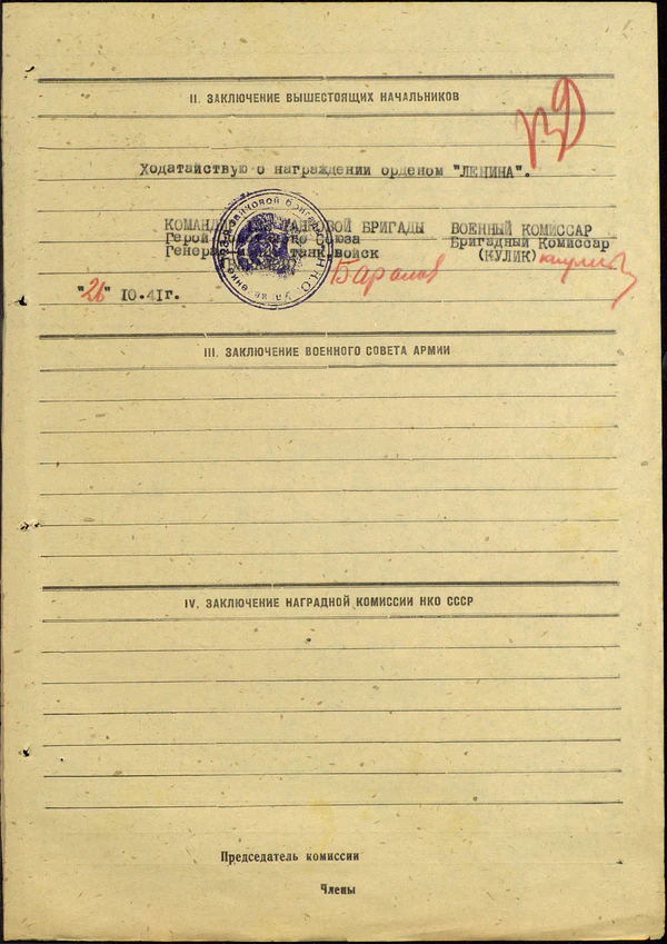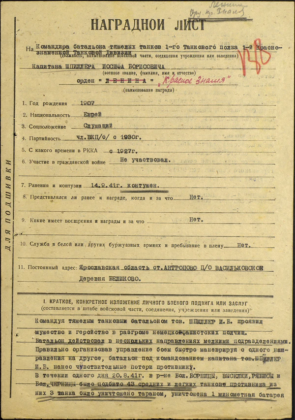 Наградной лист на капитана Шпиллера И. Б. о награждении его орденом Красного Знамени (26 Октября 1941)