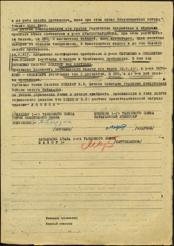 На август 1941 года, капитан И. Б. Шпиллер — командир 1-го танкового батальона тяжёлых танков (КВ-1), 1-й танковой дивизии (командир — генерал-лейтенант В. И. Баранов).