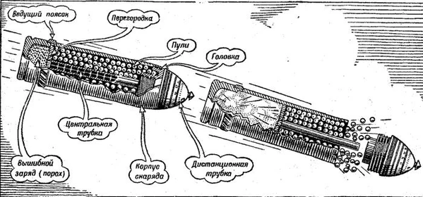 - шрапнель с центральной камерой, для поражения закрытых спереди войск.