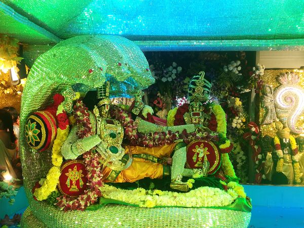 Ко времени завершения последних ритуалов Вишну торжественно предлагают отправиться на покой. В центрах массового паломничества двери для посетителей могут закрываться за полночь. В ходе последнего ритуала божество укладывается для ночного сна. Ранее надетые цветочные гирлянды и сандаловая паста убираются. Вишну предлагают молоко и фрукты. В Тирумале потомки знаменитого поэта Аннамачарьи поют Венкатешваре колыбельную песню. Считается, что ночью Брахма приходит к Венкатешваре с молитвой, поэтому серебряные чаши с водой для него оставляют в святилище[70].