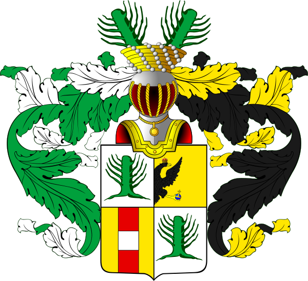 Над тем щитом стоит шлем с семью железными полосками коронованный баронской короной и с покровом шлемовным такой же краской, яко и герб украшен; на шлеме по обеим сторонам по одному древу, какое в первой и четвёртой частях на щите означено.