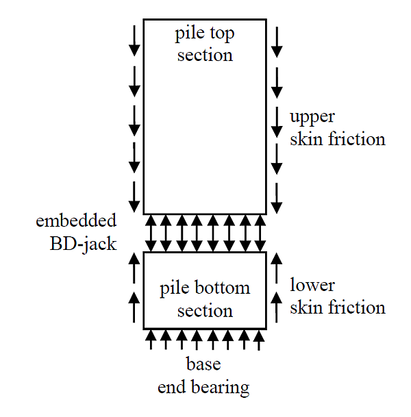 В тело сваи заливается теряемый встроенный гидравлический домкрат. При приложении нагрузки свая разделяется на две секции и нагрузка прикладывается к обеим секциям одновременно и взаимодействует друг с другом в двух направлениях; вверх против трения верхней обшивки и вниз против опоры основания и нижнего трения обшивки. На практике испытание на двунаправленную нагрузку сваи не требует реактивных балок, анкерных свай или кентледжа во время приложения нагрузки. Однако технически двунаправленный метод эквивалентен методу испытания статической нагрузкой. Другими словами, двунаправленное моделирование имитирует результаты испытаний на статическую нагрузку.