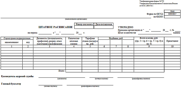 Штатное расписание содержит перечень структурных подразделений, наименование должностей, специальностей, профессий с указанием квалификации, сведения о количестве штатных единиц, должностных окладах, надбавках и месячном фонде заработной платы[3]. Применяется для оформления структуры, штатного состава и штатной численности организации[4].