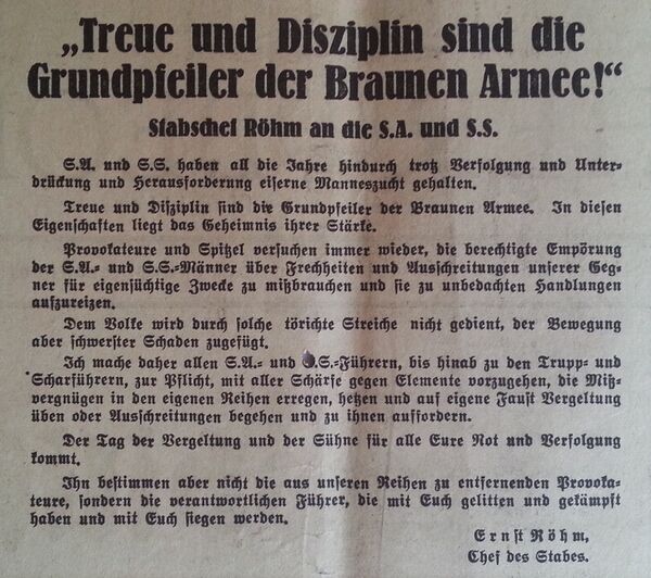 Штурмовые отряды сыграли решающую роль при подъёме национал-социалистов. После прихода НСДАП к власти штурмовые отряды короткое время имели статус вспомогательной полиции, но после лета 1934 года (так называемая «ночь длинных ножей», когда руководство СА во главе с Эрнстом Рёмом было уничтожено) они потеряли значение, и главной боевой организацией НСДАП стала СС.