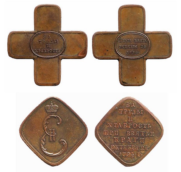 В январе 1795 Екатерина II выпустила указ: «Всем бывшим действительно на штурме Прагском штаб- и обер-офицерам, которые тут не получили орденов военного Святого Георгия и Святого Владимира, жалуем золотые знаки для ношения в петлице на ленте с чёрными и жёлтыми полосами.» На золотых крестах выбита надпись: «За труды и храбрость», на обратной стороне: «Прага взята октября 24 1794 г.» Нижние чины награждались серебряными медалями квадратной формы со слегка закруглёнными концами.