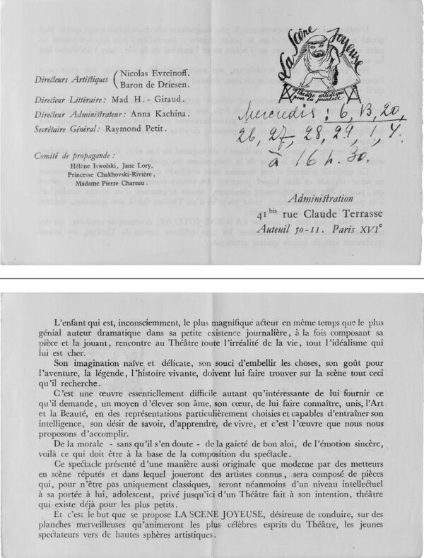 Многое в раннем периоде парижской жизни Льва (как, впрочем, и югославской) определяла причастность его двоюродного дядьки Владимира Лачинова к театральным кругам, свидетельством тому — несколько сохранившихся документов: 1). визитная карточка Н. Н. Евреинова с рекомендацией Жана, приёмного сына от второго брака Л. А. Шульца, княгине Н. И. Шервашидзе (в девичестве Бутковской); с этими театральными деятелями был хорошо знаком В. П. (в середине 1910-х годов в издательстве Н. И. Бутковской вышло несколько книг с его переводами и статьями: «Нагота на сцене», Городон Крэг и др.; знакомы они были и непосредственно по театральной жизни); 2). программа-анонс одного кратковременного театрального предприятия, руководили которым Н. Н. Евреинов и барон Н. В. Дризен (кстати, чуть ли ни единственное свидетельство их примирения после разрыва в пору «Старинного театра»). О юношеском театре-студии «Весёлая сцена» (фр. La Scène Joyeuse) пишет Анна Кашина-Евреинова: «Весной (1933) мне пришла идея устроить в сотрудничестве с одной французской журналисткой, пишущей для детей, театр для юношества. В Париже совсем не существовало такого театра. Я собрала кое-кого из друзей журналистов, актёров и писателей. Все охотно откликнулись, чтобы помочь нам. Дело закипело. Так родился театр La Scène Joyeuse»[19][20]