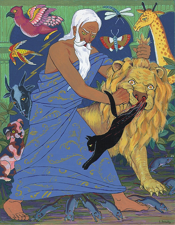 Когда эти бесподобные маленькие картины участвуют в выставках, зал, в котором они представлены, словно расцвечивается всеми цветами радуги, В памяти всплывает итальянский ренессанс или восточные страны, и мы созерцаем животных, цветы или людей — всё это маленькие чудеса гармонии, переливающиеся разными цветами на наших глазах. Что касается меня, то я особенно наслаждаюсь такими композициями как „Грусть“, которые заставляют вспомнить неоклассическую манеру Пюви де Шавана, „Революция“, где изображена несущаяся лошадь, и более всего „Мужское превосходство“, тема и линии которой показательны в своей простоте. Несомненно, наконец, и то, что в тонких душах искусство Льва Шульца встречает заслуженный успех…»[26].