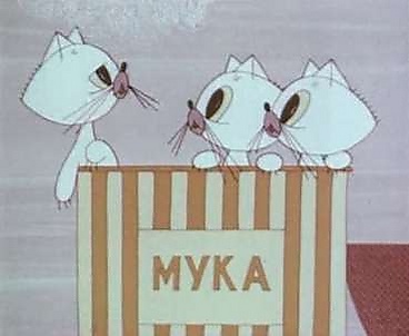 - История о трёх котятах — белом, сером и чёрном. Они всё время меняли цвет, потому что постоянно куда-то попадали: то в муку (став белыми), то в грязь (став чёрными), а искупавшись в чистой воде, стали мокрыми. И лишь высохнув, они стали прежними: один — белым, второй — серым и третий — чёрным.