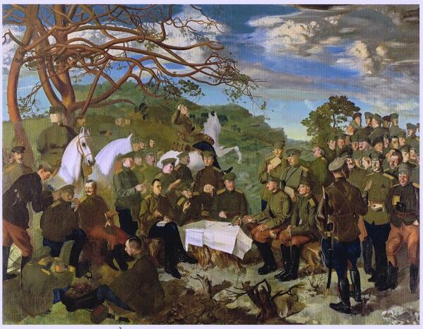 - 1916, январь — В качестве вольноопределяющегося вновь отправляется на Рижский фронт. С февраля по май создает свыше 50 портретов офицеров 4—го гусарского Мариупольского Елисаветы Петровны полка — подготовительные рисунки к картине «Полк на позициях».