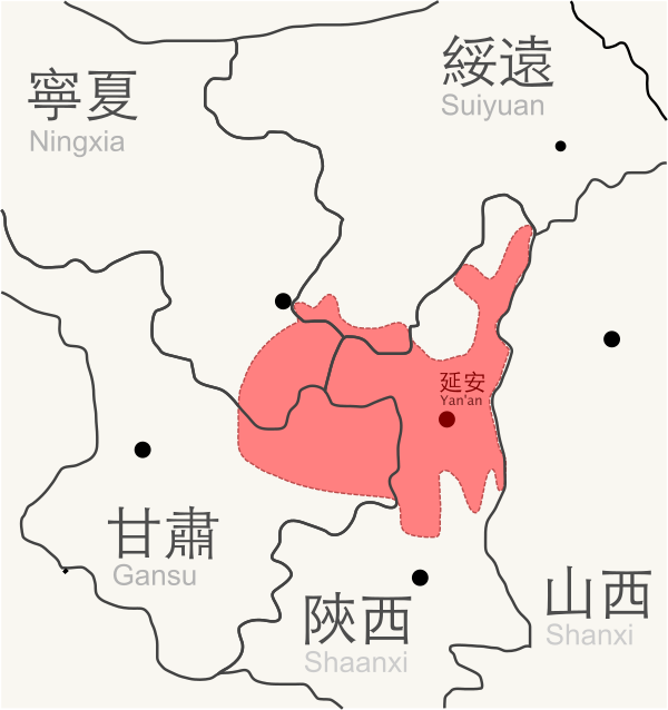 В ноябре 1934 года руководимая Лю Чжиданем Северо-Западная красная армия основала советский район на границе провинций Шэньси и Ганьсу. В январе 1935 года Шэньси-Ганьсуское пограничное советское правительство (陕甘边苏维埃政府) было переименовано в Северо-Шэньсийское советское правительство (陕北省苏维埃政府). В октябре 1935 года в эти места прорвались части китайской Красной армии, завершившие Великий поход, и этот район стал главной базой китайских коммунистов. С января 1937 года Центральный комитет КПК разместился в Яньане.