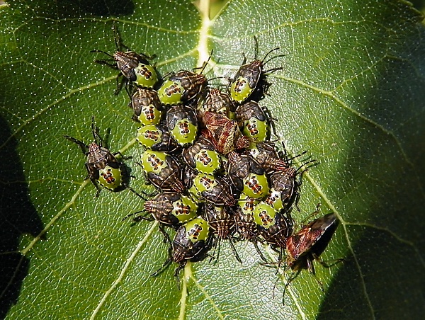 Самки серого щитника иногда охраняют свои кладки бок о бок на одном и том же листе берёзы. Очевидно, что скопление самок не является следствием недостатка мест для откладки яиц, поскольку наличие подходящих мест для яйцекладки практически не ограничено. Одно дерево берёзы содержит сотни тысяч листьев, но не более 30—40 клопов серых щитников. Кроме того, листья не являются ресурсом для потомства, которое после вылупления питается развивающимися семенами. Возможно, что самки защищают свой выводок более эффективно, если они находятся вместе. В Финляндии встречаемость совместной охраны у серого щитника различается в разных местах. Например, в Товеторпе все наблюдаемые 45 самок были одиночными, так же как и в Тварминне (120 самок). В Турку было 4 пары и 32 одиночные самки. Около Корпилахти обнаружено 39 групп самок (18 пар, 1 трио) и 89 одиночно охраняющих самок[23].