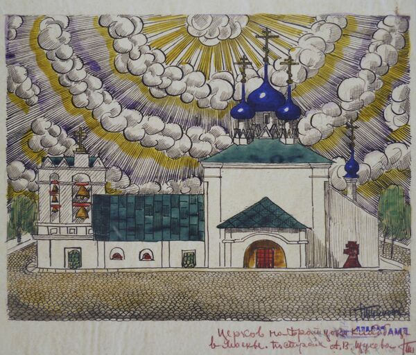 Конкурс проектов планировки выставки выиграл Жолтовский[124], а Щусев, как её главный архитектор, возглавил организацию работ[123]. Он привлёк к проектированию павильонов созвездие архитекторов и художников, от ветеранов Ф. О. Шехтеля[125] и В. А. Щуко[126] до ещё никому не известных студентов Н. А. Ладовского[127]. Павел Щусев разработал деревянное перекрытие павильона «Госсельхозсклада»[128], а сам Щусев приспособил под «кустарный павильон» кирпичный цех бывшего судостроительного завода «Крымский Бромлей» у Крымского моста[129][130]. Чертежи павильона выполнил А. В. Снигарёв, интерьеры — Г. П. Пашков и Н. П. Пашков, дизайн фасадов — А. А. Дейнека[131][130]. Белёный лепной декор, гжельская майолика фасадов и ступенчатая башня над бывшим эллингом отчасти повторяли мотивы уже осуществлённой части Казанского вокзала, отчасти послужили образцом для ещё не завершённых его частей[129][132]. По завершении выставке в павильоне разместился рабочий клуб Гознака[133], а в 1930-е годов он был перестроен в ныне существующее здание администрации парка Горького с кинотеатром[134]. Другие постройки Щусева 1920—1924 годов — пропилеи на Тверской площади и два деревянных мавзолея Ленина — были временными, и были вскоре разобраны[135][136].