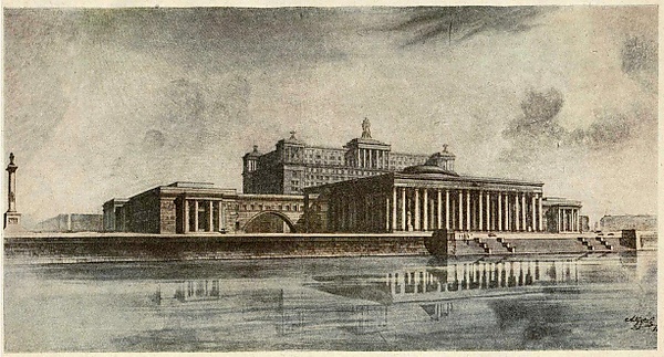 В 1934—1936 годы мастерская Щусева опубликовала немало проектов роскошных, эклектичных и подчас фантастичных зданий для Москвы, предвещавших позднейшую, послевоенную сталинскую архитектуру[200][201]. Щусев последовательно развивал стилистику западного фасада гостиницы «Москва»: верхние этажи решались как аркады прямоугольных лоджий, визуально усиливававших карнизные тяги[202]. Торцевые ризалиты, так же как в «Москве», Щусев трактовал как угловые башни[202]. Основной мотив интерьеров — коринфские колонны квадратного сечения, поддерживающие кессонированный потолок[202]. Из этих проектов были построены, и то не в полном объёме, лишь «дом архитекторов» на Ростовской набережной и дом на Смоленской набережной, 12 (оба в соавторстве с А. К. Ростковским, 1934—1939)[200][203]. Предложенные в 1934 году «дом Аэрофлота» Чечулина и «дом колхозника» Щусева[203] не были приняты к постройке. Предложенный тогда же[203] театр Навои в Ташкенте был завершён в 1947 году в упрощённых формах и в уменьшенном масштабе[200]. Упростился в ходе строительства и Большой Москворецкий мост (соавторы П. М. Сардарян, П. В. Щусев, 1936—1938)[204]. В первоначальном проекте мост должен был быть украшен скульптурами В. И. Мухиной, однако весь выделенный на архитектурное оформление бюджет был потрачен на каменную облицовку, и заказ на скульптуру был отменён[204]. После этого инцидента Мухина более никогда не работала с Щусевым[204].