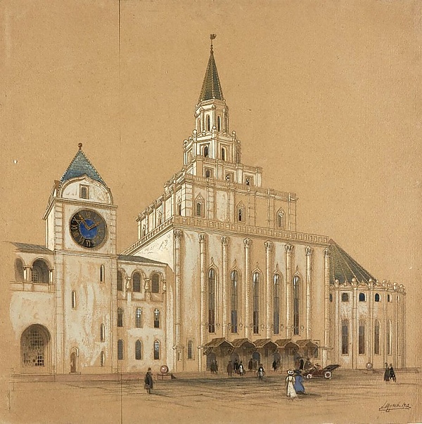 В октябре 1911 года Щусев выиграл закрытый конкурс на проектирование Казанского вокзала в Москве[88] и был назначен его главным архитектором[89]. Он переехал из Петербурга в Москву и поселился в доме 25 по Гагаринскому переулку[89]. В 1912—1913 годы Щусев организовал экспедиции в старинные города для изучения древнерусской архитектуры, и использовал собранный материал для уточнения проекта[90]. Ярусная башня вокзала восходит одновременно и к башне Сююмбике в Казани, и к Боровицкой башне московского Кремля — и в то же время по-своему уникальна[90]. Часовая башня фасада — вариация на тему башни Св. Марка в Венеции[91].