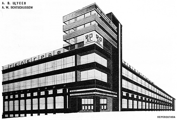 В 1925 году Щусев участвовал в трёх архитектурных конкурсах первого плана — на проекты Госпрома в Харькове и здания Центрального телеграфа и Госбанка в Москве[170]. Все три проекта были откровенно конструктивистские, и все три проиграли[170]. По мнению А. В. Иконникова, щусевский проект Центрального телеграфа был самым ярким на конкурсе, и был отклонён по формальной причине — сплошное остекление противоречило конкурсной программе[171]. В 1927—1929 годы Щусев проиграл ещё один престижный конкурс, на проект библиотеки имени Ленина[172]. Его неоклассический проект, представленный на первый тур, был объявлен «устаревшим»[172]. На второй тур Щусев представил модернистский проект, напоминавший работы не столько советских конструктивистов, сколько Ле Корбюзье и Эриха Мендельсона[172]. Конкурирующая «фирма» В. А. Щуко и В. Г. Гельфрейха действовала в обратном порядке, представив сначала конструктивистское решение, а затем тот же проект в стилистике ар деко[172]. Последний и был принят к строительству[172]. Авангардисты всех фракций единодушно осудили «стилистическое двурушничество» и Щусева, и Щуко[173]. В среде архитекторов закрепилось представление о беспринципной всеядности Щусева[173], которое проникло даже в советский учебник 1985 года[174]. Нестеров признавал, что «Щусев — любитель не столько стилей, сколько стилизаций»[175][176].