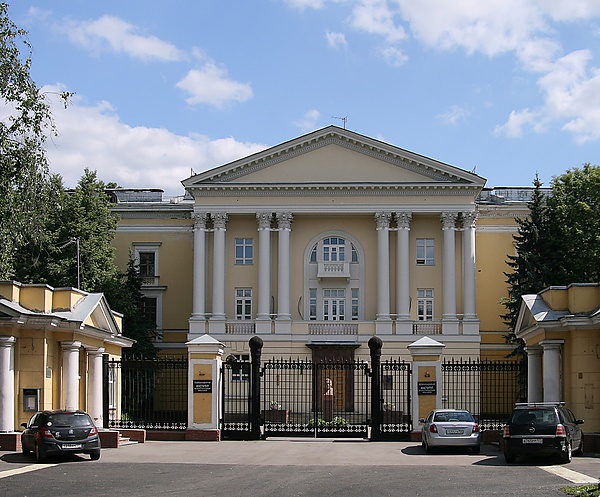 Академия наук, в 1934 году переведенная из Ленинграда в Москву по решению Политбюро, ютилась во временных помещениях и остро нуждалась в новых, современных зданиях[231]. Ещё в 1935 году Щусев выиграл открытый конкурс на проект новой Академии, которую тогда планировали строить за Калужской заставой[232][233]. Принятый позже генеральный план реконструкции Москвы отвёл главному зданию, библиотеке и музеям Академии участок в Замоскворечье, в непосредственной близости от площадки Дворца Советов[231][234], где со времён выставки 1923 года располагался спроектированный А. К. Буровым cтадион завода имени Сталина[126]. Институтам и жилым домам Академии предназначался район к югу и юго-западу от Калужской площади[231][234]. Строительство комплекса президиума Академии началось с музейного корпуса на Крымском Валу, но было заморожено с началом войны в 1941 году и более не возобновлялось[235][233]; в 1965—1983 годы на пустовавшей площадке построили Центральный дом художника и заложили парк[236]. До войны Щусев успел завершить лишь жилой дом на Большой Калужской (Ленинский проспект, 13, в соавторстве с А. К. Ростковским) и здание института генетики (Ленинский проспект, 55), выдержанное в упрощённых ренессансных формах и композиционно близкое зданию ИМЭЛ[237].