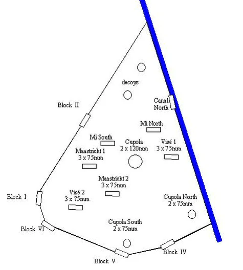- Maastricht I и II (Маастрихт I и II) содержали по три 75 миллиметровых пушки у каждого дома, направленных на север к Маастрихту.[10][18][19]