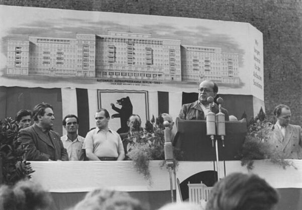 После капитуляции Германии и крушения нацистского режима Фридрих Эберт-младший занялся восстановлением структур СДПГ и стал председателем отделения партии в провинции Бранденбург[5]. Будучи сыном бывшего рейхспрезидента, Эберт стал одним из ведущих политических лидеров Восточной Германии, сотрудничал с лидерами Коммунистической партии, нацеленных на союз с СДПГ, понимая роль его отца в расчленении единства немецкого рабочего класса в 1918 году. Эберт-младший сыграл важную роль в слиянии СДПГ и КПГ в Социалистическую единую партию Германии в советской зоне оккупации Германии, после чего стал с 1946 года членом Центрального комитета и с 1949 года Политбюро ЦК СЕПГ. В 1946 году Советской военной администрацией в Германии он был назначен членом Консультативной ассамблеи Бранденбурга, и стал её председателем[6]. После выборов в советской зоне оккупации, 22 ноября 1946 года он стал председателем ландтага Бранденбурга, и занимал этот пост до 12 февраля 1949 года[9]. По некоторым данным, в 1948 году он хотел бежать на Запад с другом, бывшим членом Политбюро ЦК СЕПГ Эрихом Гнифке, но слишком поздно получил сообщение о дате отъезде и остался в ГДР. После этого, по рекомендации Вильгельма Пика[10], 30 ноября 1948 года Эберт был назначен первым обер-бургомистром Восточного Берлина[6][11], что не было признано западными странами[12]. После этого он переехал в дом № 13 на Ваншаффе-штрассе в Нидершёнхаузене[6].