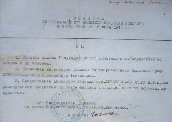 Филиал Эрмитажа в Свердловске (в составе 18 сотрудников) был образован 15 июля 1941 года приказом Комитета по делам искусства при СНК СССР. Тем же приказом директором филиала был назначен Владимир Францевич Левинсон-Лессинг.