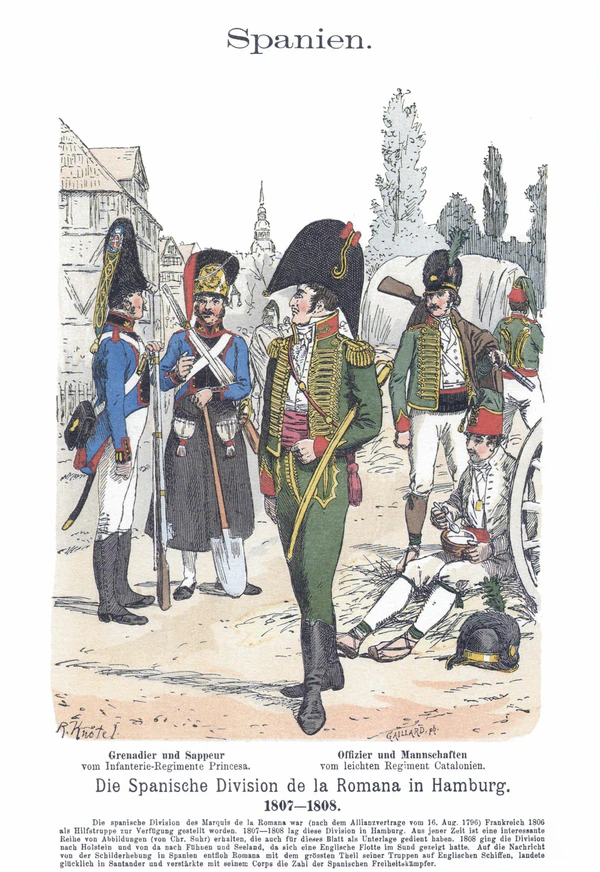 В марте 1807 года 15 тыс. испанских солдат отправились в Северную Европу под командованием Педро Каро, 3-го маркиза де ла Романы[2]. В дивизии было 14 батальонов пехотинцев и пять конных полков. Их первым пунктом назначения стал Гамбург[3]. Подразделение Романы служило при маршале Гийоме Брюне во время осады Штральзунда, которая закончилась 20 августа 1807 года, когда шведский гарнизон покинул город. Брюн командовал войском в 40 тыс. военнослужащих из Франции, Голландского королевства, Королевства Италии, Великого княжества Баденского и прочих германских государств. В состав испанского контингента входило 9763 пехотинца, 2340 кавалеристов в 12 эскадронах, 324 артиллериста в четырёх лёгких артиллерийских батареях и 104 сапера. Защитники города потеряли 998 человек убитыми, ранеными, пропавшими без вести и умершими от болезней. Испанские потери неизвестны[4].