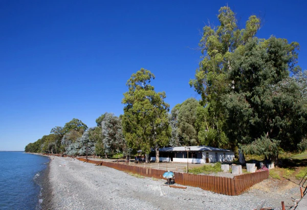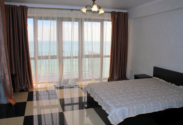 Пансионат расположен на огороженной территории на берегу Чёрного моря в эвкалиптовой роще. Имеет собственный галечный пляж, расстояние от корпусов до пляжа около 50 метров. С территории отеля на берег необходимо спуститься по лестнице. Вход в море крутой. Протяжённость пляжа 500 метров, ширина 10 метров. Оборудован кабинками для переодевания и деревянными лежаками. Шезлонги и зонты предоставляют за отдельную плату[2].