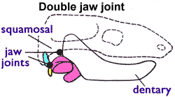 У ранних амниот (включая ящериц, крокодилов, динозавров, птиц, терапсид) сочленение нижней челюсти с прочими костями черепа образуется посредством сочленовной и квадратной костей, единственной косточкой в их среднем ухе является стремя. У млекопитающих же сустав устроен по-другому: нижняя челюсть непосредственно сочленяется с височной костью (или с чешуйчатой костью, аналогом чешуйчатой части височной кости человека, лат. pars squamosa ossis temporalis), тогда как в их среднем ухе имеются две дополнительных кости (молоточек и наковальня)[15].