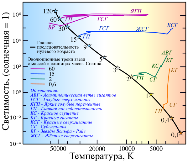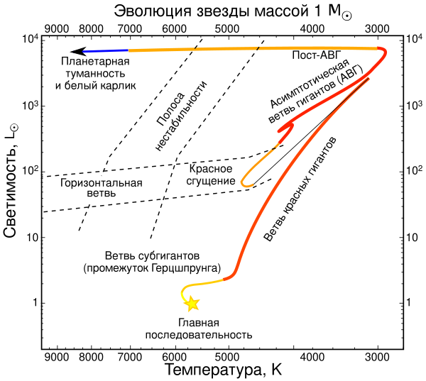 Это приводит к движению звезды на диаграмме Герцшпрунга — Рассела вверх и вправо. У звёзд с массами менее 2,3 M⊙ путь звезды на диаграмме проходит довольно близко к ветви красных гигантов, лишь с немного более высокой температурой, из-за чего эта стадия получила название «асимптотическая ветвь гигантов». Этот же термин используется для описания эволюции звёзд тяжелее 2,3 M⊙, хотя для них асимптотическая ветвь гигантов расположена значительно выше ветви красных гигантов[32][39].