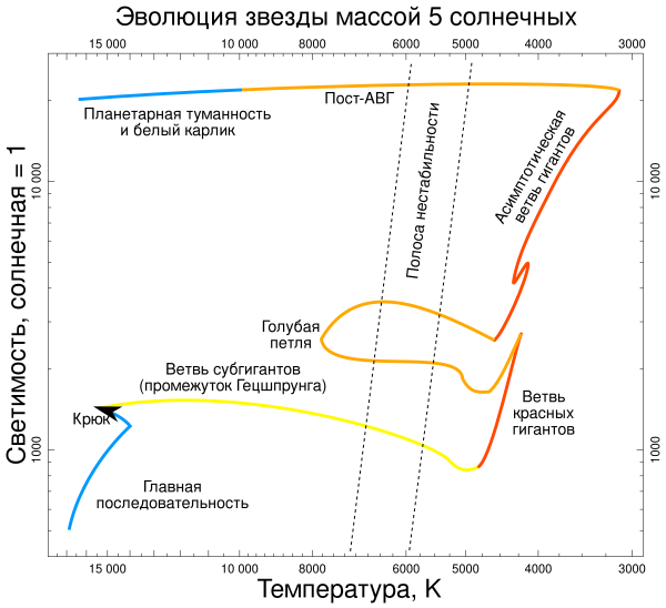 Когда ядро звезды средней массы становится практически полностью гелиевым, реакции в нём прекращаются. Водород всё ещё присутствует во внешней оболочке вокруг ядра, где у звёзд массой до 1,5 M⊙ уже идёт синтез гелия. В звёздах с большей массой гелий в оболочке ещё не синтезируется: сначала начинается кратковременное сжатие, которое приводит к разогреву оболочки ядра и началу горения водорода в ней. Звезда немного нагревается и становится ярче, и на диаграмме Герцшпрунга — Рассела сжатие соответствует движению вверх и влево — так называемому крюку (англ. hook)[39][61].