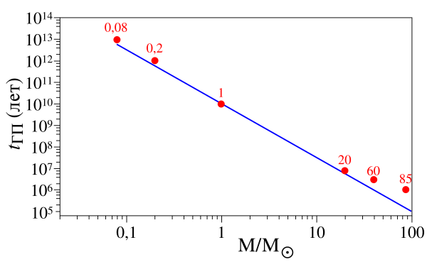 Перейдя на главную последовательность, звезда остаётся на ней большую часть времени жизни — около 90 %. Это обусловлено тем, что светимость звёзд на стадии главной последовательности низка по сравнению с другими стадиями, а удельное энерговыделение при синтезе гелия выше, чем при других термоядерных реакциях[21][51][52]. Длительность стадии главной последовательности соответствует ядерной временной шкале для горения водорода, то есть, времени, за которое звезда излучает всю энергию, которая выделяется в реакциях превращения водорода в гелий[38][53]. У самых тяжёлых звёзд, по разным оценкам, она составляет от одного до нескольких миллионов лет[54], а у самых маломассивных — порядка 10 триллионов лет, что превышает возраст Вселенной[5]. Для Солнца срок нахождения на главной последовательности составит 10—13 миллиардов лет[22][33][55]. Большая часть дальнейших стадий эволюции также идёт по ядерной временной шкале, но уже не для водорода, а для других элементов, поэтому занимают меньше времени[38][53].