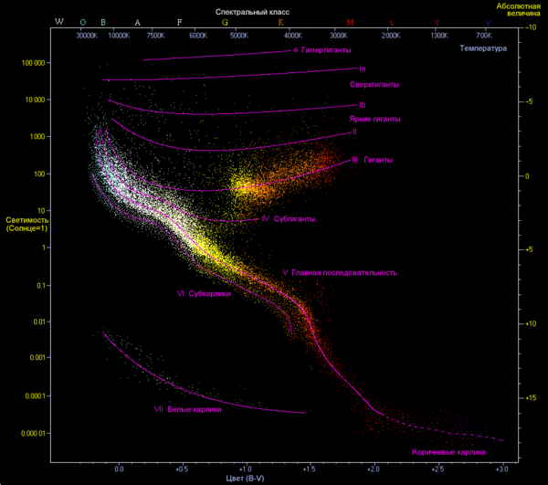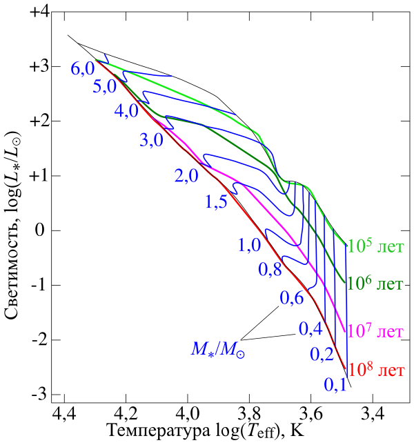 Когда сжатие заканчивается и термоядерные реакции синтеза гелия из водорода становятся единственным источником энергии, протозвезда становится звездой главной последовательности. Возраст звезды принято отсчитывать именно с этого момента. Звёзды нулевого возраста образуют так называемую нулевую главную последовательность, расположенную в нижней части этой области диаграммы[46][47]. В это время их химический состав сформировавшихся звёзд всё ещё близок к составу межзвёздной среды: они состоят в основном из водорода (около 91 %) и гелия (около 9 %), тогда как более тяжёлых элементов — менее 1 %[48][49]. Звёзды главной последовательности имеют широкий диапазон параметров, которые определяются в первую очередь их массой и в меньшей степени металличностью. Так, например, звезда с массой 0,1 M⊙ будет иметь светимость в 0,0002 L⊙, температуру 3000 K и спектральный класс M6, а звезда с массой 18 M⊙ — светимость в 30000 L⊙, температуру 33000 K и спектральный класс O9,5[4]. Также от массы зависит внутреннее строение звёзд: звёзды малых масс полностью конвективны, у звёзд промежуточных масс происходит лучистый перенос в ядре и конвекция во внешних слоях, а у массивных звёзд — конвекция в ядре и лучистый перенос во внешних слоях. Конвекция приводит к относительно быстрому перемешиванию вещества, что выравнивает химический состав конвективного слоя. Это влияет на то, будет ли сохраняться при дальнейшей эволюции однородность слоёв звезды по химическому составу и на её дальнейшую эволюцию[17][50].