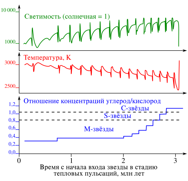 Вторая часть, известная как фаза температурных пульсаций (англ. thermally pulsing phase), наступает, когда гелиевый слоевой источник доходит до оставшейся водородной оболочки. С этого момента слоевые гелиевый и водородный источники начинают чередоваться: звезда становится очень нестабильной, начинает пульсировать и терять массу, выбрасывая вещество и несколько раз перемешивая собственное вещество; период пульсаций звезды составляет от десятков до сотен тысяч лет[68]. На этой стадии у звёзд с массами более 1,2—1,5 M⊙ происходит третье вычерпывание, при котором на поверхность может быть вынесено большое количество углерода, в результате чего звезда может стать углеродной звездой[32]. Звёзды массой менее 8 M⊙ не в состоянии создать в недрах достаточно высокую температуру, чтобы началось ядерное горение углерода, и для них эта стадия становится последней, на которой идут термоядерные реакции — после сброса оболочки от звезды остаётся белый карлик, состоящий из углерода и кислорода[32][39]. К концу этой стадии масса Солнца будет составлять 0,54 M⊙[22].