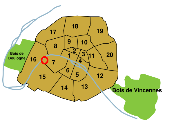 Эйфелеву башню воздвигли на Марсовом поле напротив Йенского моста через реку Сену, на набережной Бранли. На схеме Парижского метрополитена — станция Bir-Hakeim[3].