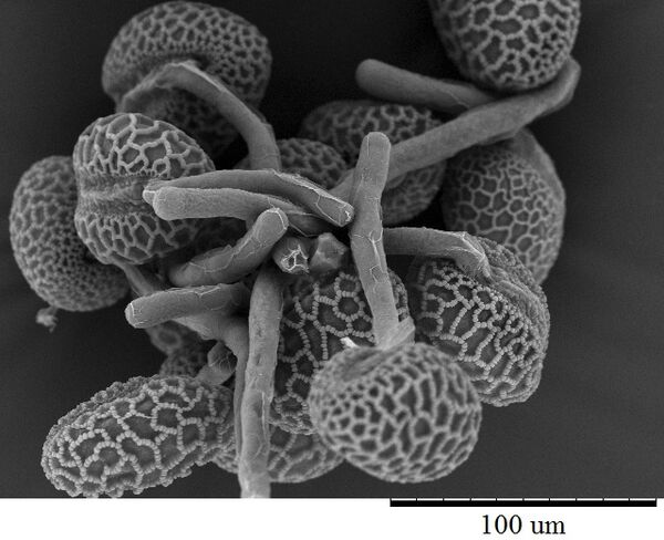 Защищая пылинку от высыхания, экзина не препятствует в то же время проникновению воды к заключённому внутри неё протопласту. Некоторые места экзины остаются неутолщенными и легко проницаемыми для воды. Эти же места, когда протопласт разбухнет от воды и пылинка начнёт «прорастать», легко разрываются; сквозь получившееся отверстие выпячивается наружу содержимое пылинки, одетое легко растяжимой, тонкой интиной и вытягивающееся в конце концов в длинную «пыльцевую трубку» (см. фото слева).