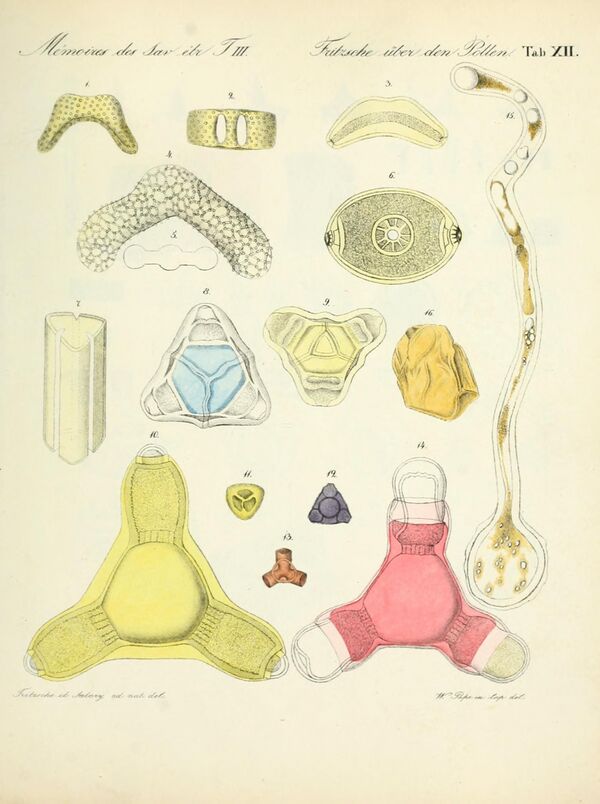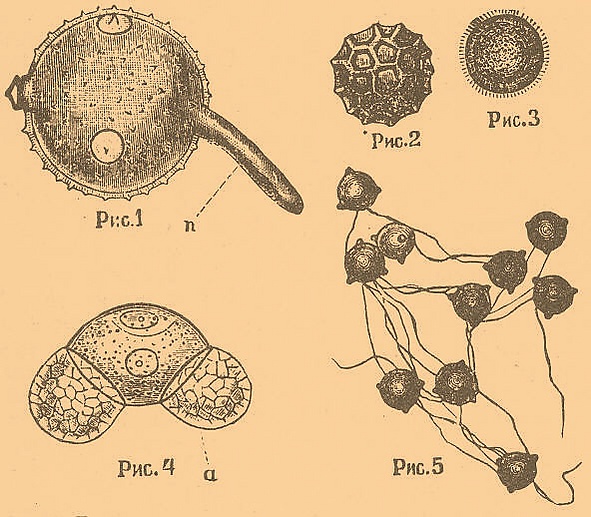 В более простых случаях такие тонкие места в экзине имеют вид простых углублений округлой формы; в более сложных случаях места выхождения пыльцевых трубочек обнаруживают нередко очень оригинальное устройство: так, например, у тыквы они имеют вид легко сваливающейся крышечки, так как тонкие места в экзине имеют здесь форму кольцеобразной выемки (см. фиг. 1). Что касается строения экзины, то часто удаётся обнаружить в ней исчерченность, как будто она сложена из маленьких тоненьких столбиков (см. фиг. 1); внешний же вид экзины бывает чрезвычайно разнообразен, причём в общем свойства экзины обусловливаются способом опыления у соответствующего растения. У растений, опыляемых ветром (анемофильные растения), экзина гладкая, сухая, так что круглые по большей части пылинки легко отделяются друг от друга и в виде тонкой пыли разносятся ветром. Оригинальное приспособление к передвижению пыльцы по воздуху мы встречаем у различных хвойных растений: экзина у них вздута по бокам пылинки в два воздушных мешка. Это настолько уменьшает удельный вес зернышка, что оно долго летает по воздуху, приподнимаясь кверху даже при самом слабом восходящем токе. Что касается растений, опыляемых насекомыми (энтомофильные растения), то экзина у них по большей части снабжена различного рода выростами, гребнями, шипиками. Кроме того, снаружи экзина покрыта слоем жира или бесформенными скоплениями клейкого вытягивающегося в нити вещества — «висцина». Эти особенности обусловливают то, что пылинки у энтомофильных растений легко соединяются между собой в комочки и легко прилипают к насекомым. Когда было установлено родство между цветковыми растениями и высшими споровыми (папоротникообразными) и когда оказалось, что пылинка соответствует споре (микроспоре) этих последних, пришлось распространить название экзины и на наружную оболочку споры папоротникообразных, носящую ещё название «экзоспория». С точки зрения упомянутого родства получает особый интерес то обстоятельство, что зародышевый мешок голосеменных растений, соответствующий макроспоре папоротникообразных, ещё одет довольно толстой кутинизированной двуслойной оболочкой, обладает, следовательно, экзиной.