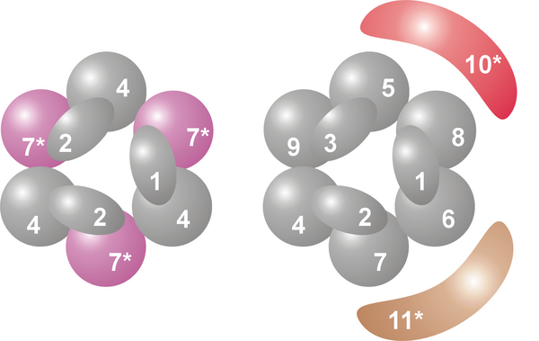 - B У человека в этой позиции комплекса могут находиться два разных белка: либо Dis3L1 (если экзосома находится в цитоплазме), либо Dis3 (если экзосома находится в ядре).