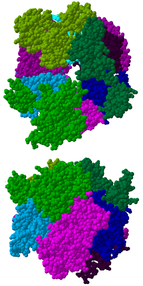 Поверх этих кольцевых белков располагаются три белка, содержащих РНК-связывающие домены S1. У двух из трёх этих белков, кроме того, имеется К-гомологичный домен[7]. У эукариот все три этих S1-содержащих белка различны, а у архей они представлены белками одного или двух различных видов, хотя во всех случаях к кольцу прикрепляется только три субъединицы[11].