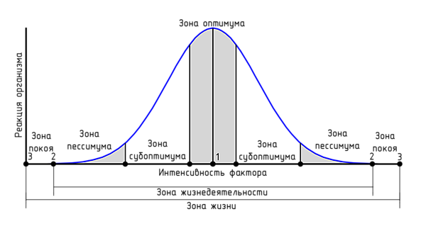 - зона жизнедеятельности — диапазон значений фактора, в котором он активно проявляет свои жизненные функции