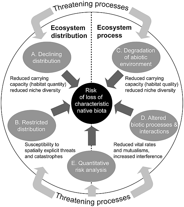 Концепция коллапса экосистемы используется в системе для определения категорий риска классификации рисков, связанных с экосистемами. Категория «Коллапс» служит в качестве предельного значения для оценки риска. Другие категории риска (уязвимые, находящиеся под угрозой исчезновения и находящиеся под критической угрозой исчезновения) определяются с учётом вероятности или риска коллапса[7]. В исследовании Бланда и других учёных были предложены четыре критерия для определения коллапса экосистемы при оценке риска[17]: