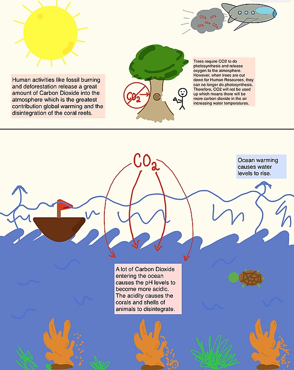 Одной из главных проблем для морских биологов является разрушение экосистем коралловых рифов[33]. Из-за глобального потепления уровень моря повышается, что может привести к затоплению рифов или обесцвечиванию кораллов. Деятельность человека, такая как рыболовство, добыча полезных ископаемых и вырубка лесов, представляет опасность для коралловых рифов, поскольку влияет на их среду обитания. Например, исследования показывают, что потеря 30-60 % разнообразия коралловых рифов связана с деятельностью человека, такой как загрязнение сточными водами и промышленными выбросами[34].