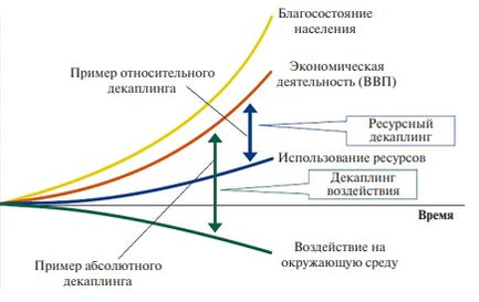 - декаплинг (англ. Decoupling). Под этим термином понимается процесс разрыва зависимости между экономическим ростом и увеличением нагрузки на окружающую среду[18]. Цель — снизить удельный объём загрязнений и энергопотребления на единицу ВВП, что достигается посредством технологической модернизации и внедрения энергосберегающих технологий[19].