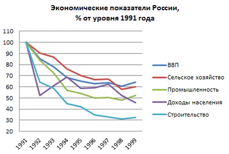 Под влиянием «шоковой терапии» уровень жизни населения упал по меньшей мере в два раза и достиг уровня 1913 года[68].