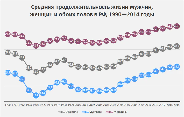 Ежегодная смертность трудоспособного населения возросла почти с 49 до 58 человек на тысячу в 1992 г. по сравнению с 1990 г., а к 1994 г. достигла 84 человек в год на тысячу населения. Средняя продолжительность жизни мужчин в России снизилась почти на 6 лет[57].
