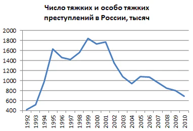 Либеральные реформы 1990-х, как отмечают исследователи, вызвали значительный рост преступности в России[65][66][67]. Факторами роста преступности являлись, в частности, обнищание населения, ослабление правоохранительных структур (милиции) и судебной системы в результате недофинансирования, ослабление моральных норм[65].